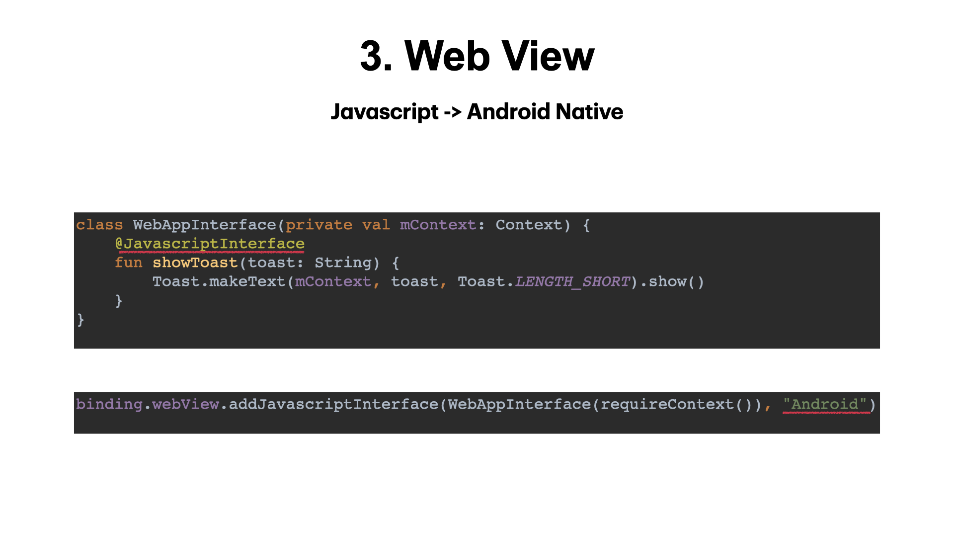 그리고 자바스크립트에서 Android.showToast 이런식으로 실행해주면 네이티브에서 함수가 호출됩니다.