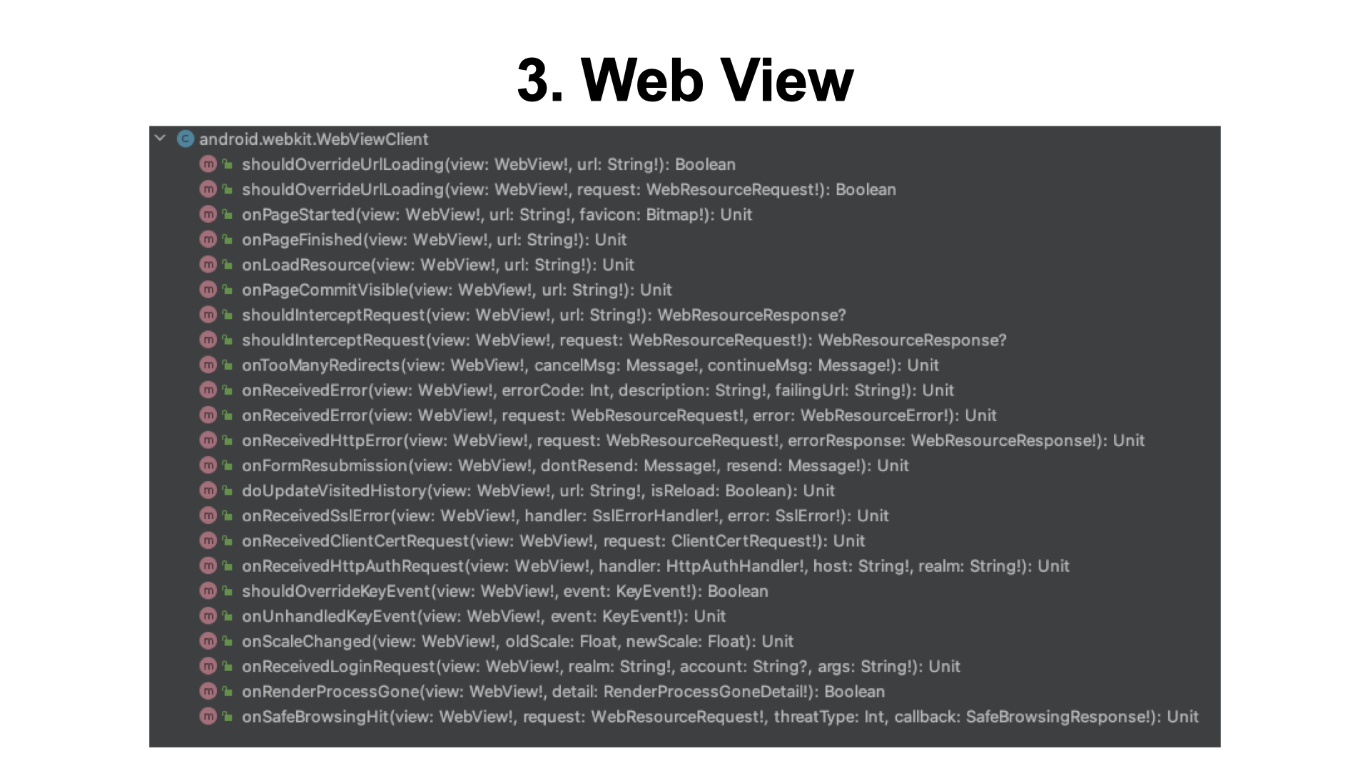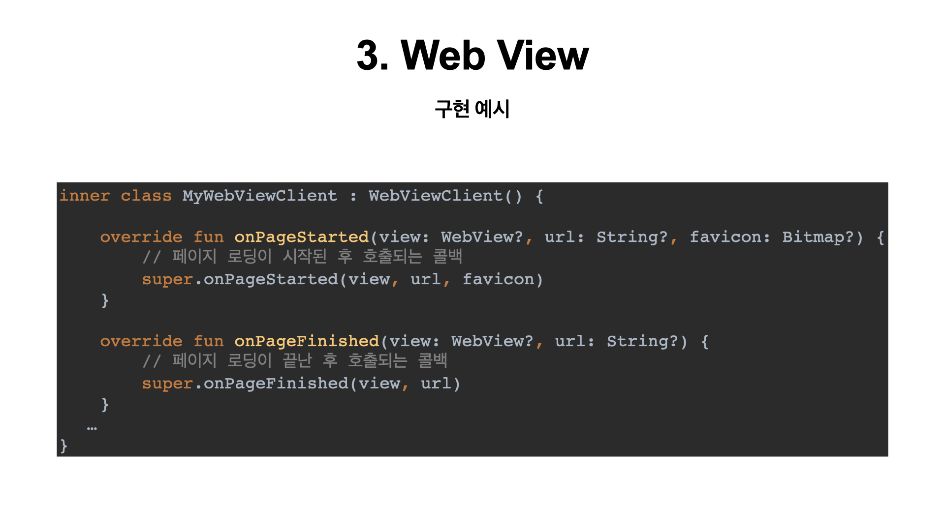 onPagestarted onPageFinished처럼 페이지가 시작된 후 호출되는 콜백과 페이지 로딩이 끝난 후 호출되는 콜백이 있습니다.