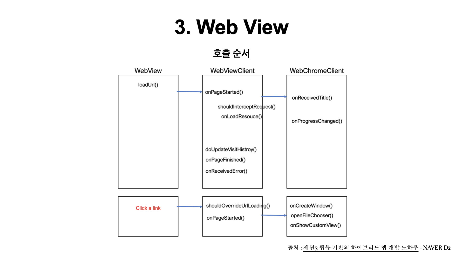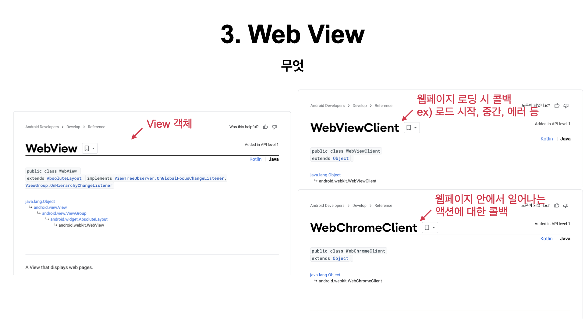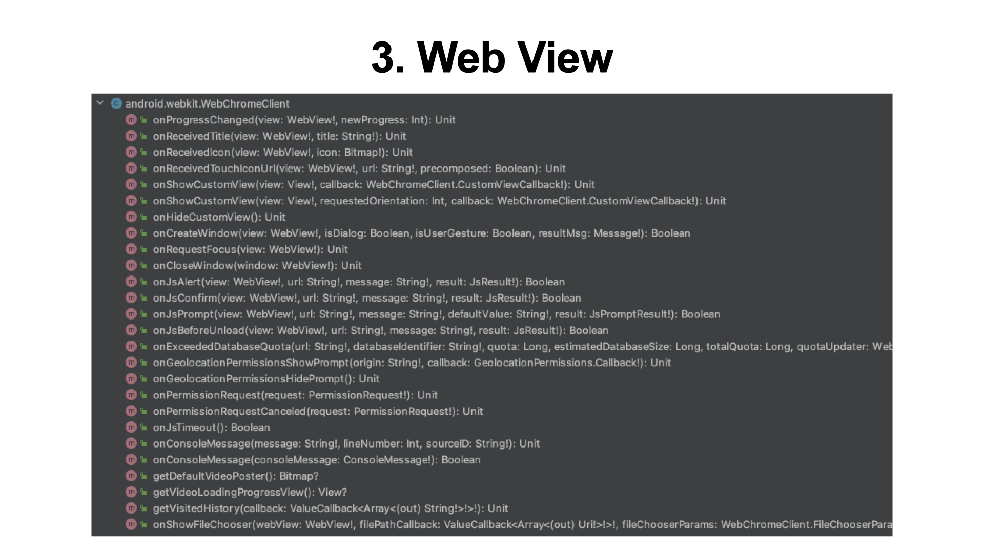 그리고 웹뷰를 사용할 때는 웹뷰와 웹뷰 클라이언트, 웹뷰 크롬 클라이언트 3가지 클래스를 대표적으로 사용합니다.