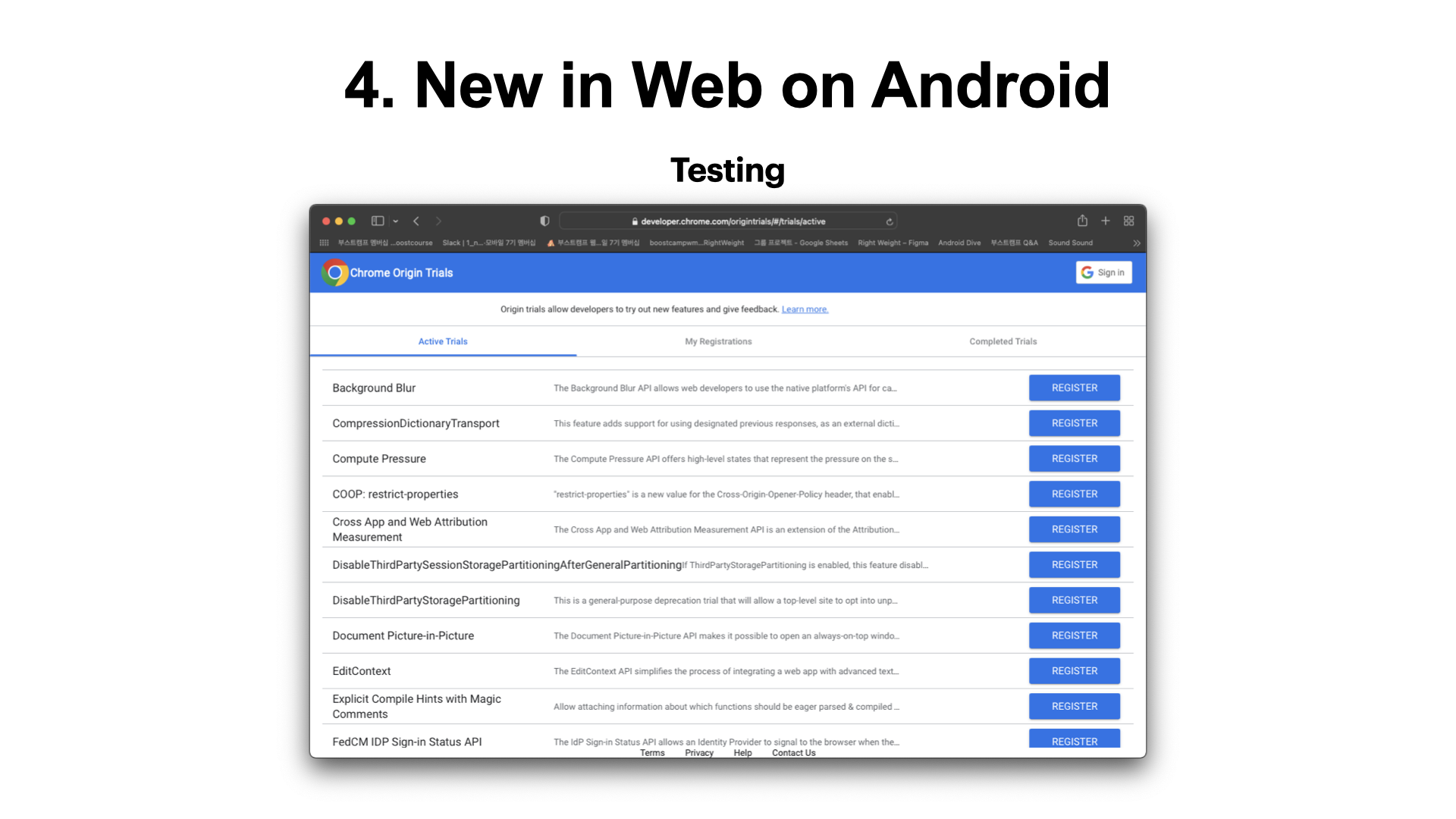 그리고 이제 웹뷰에서도 chrome origin trials 를 사용할 수 있게 되었습니다 .