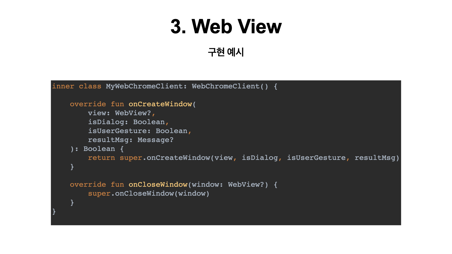 앞의 예제에서는 기본 웹뷰 클라이언트를 사용했는데 웹 뷰 클라이언트를 상속받아 구현할 수도 있습니다.