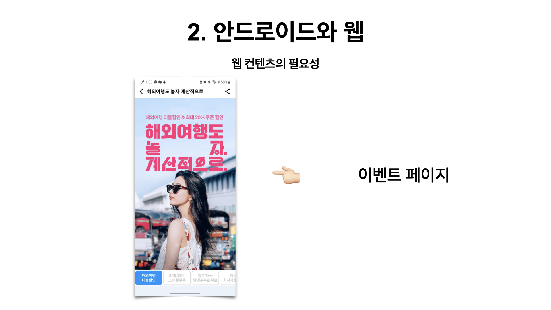 두 번째 이유로, 이벤트 페이지 처럼 자주 변하는 화면은 웹로 하는게 좋습니다.