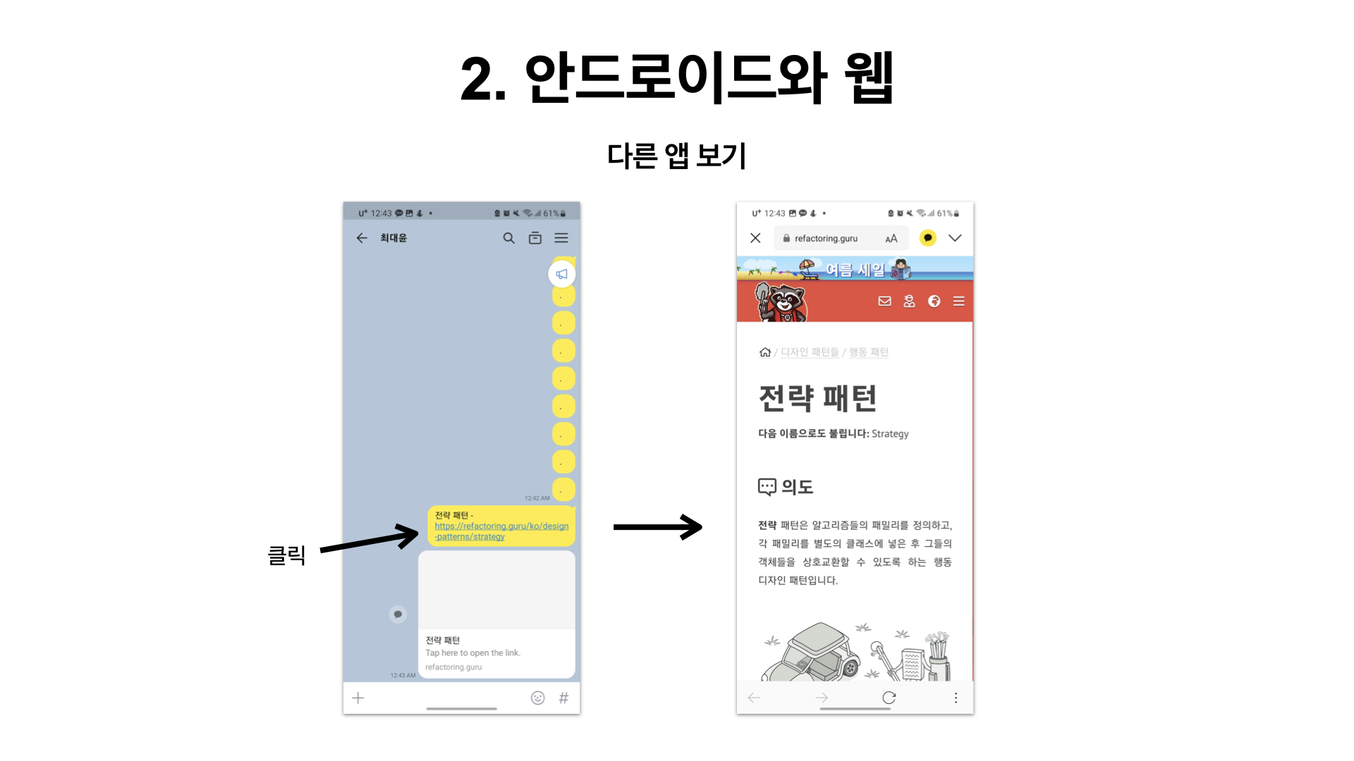대표적으로는 카카오톡에서 링크를 클릭했을 때가 있겠습니다. 앱안에서 링크가 열리는 것을 볼 수 있습니다.