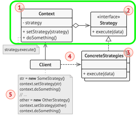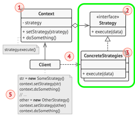fun main() { val context = Context(ConcreteStrategyAdd()) println(context.executeStrategy(10, 5)) context.setStrategy(ConcreteStrategySubtract()) println(context.executeStrategy(10, 5)) context.setStrategy(ConcreteStrategyMultiply()) println(context.executeStrategy(10, 5)) }