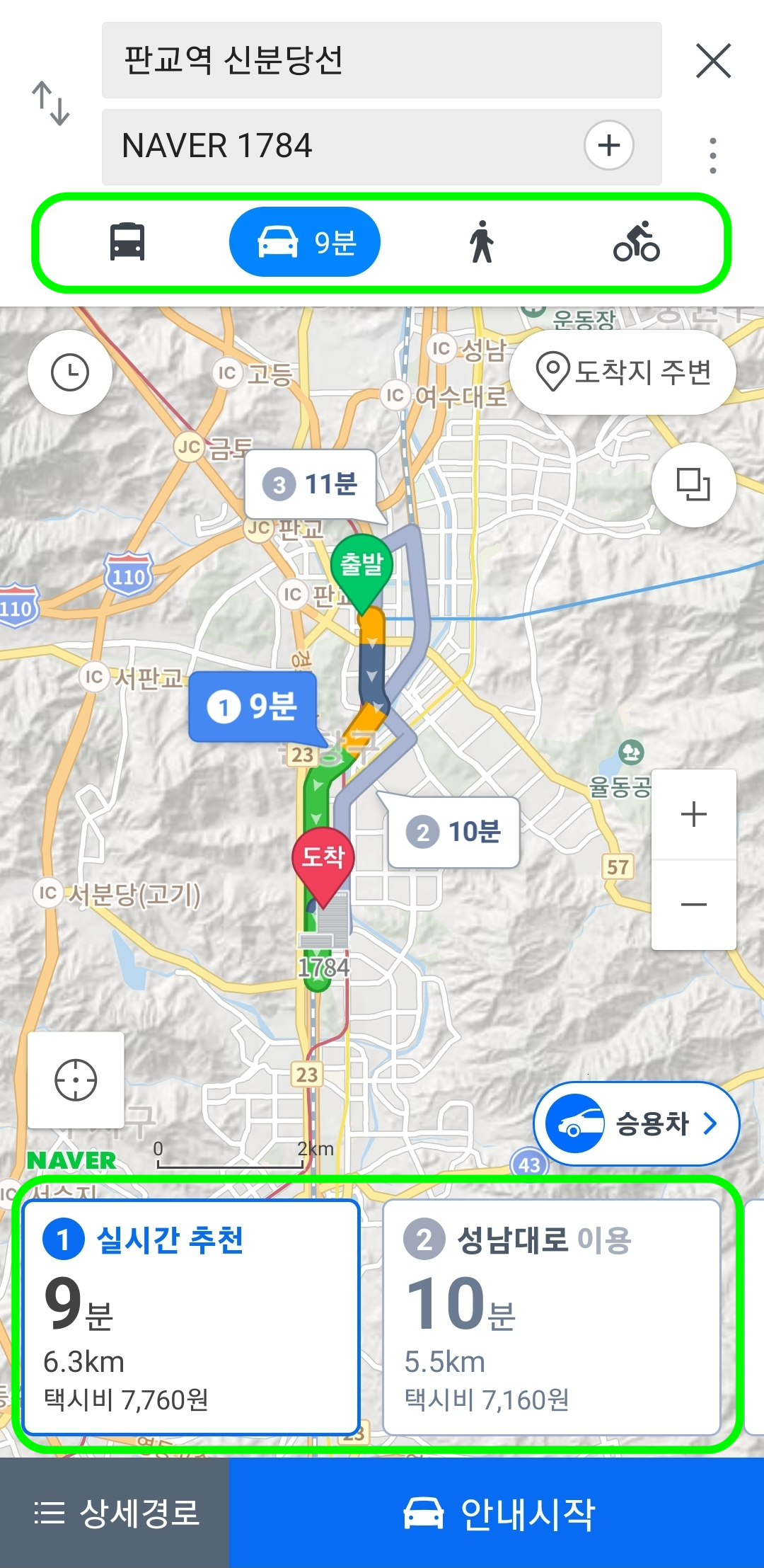 → 자차 경로, 도보 경로, 자전거 경로 등, 경로에 대한 옵션이 추가될 수 있음